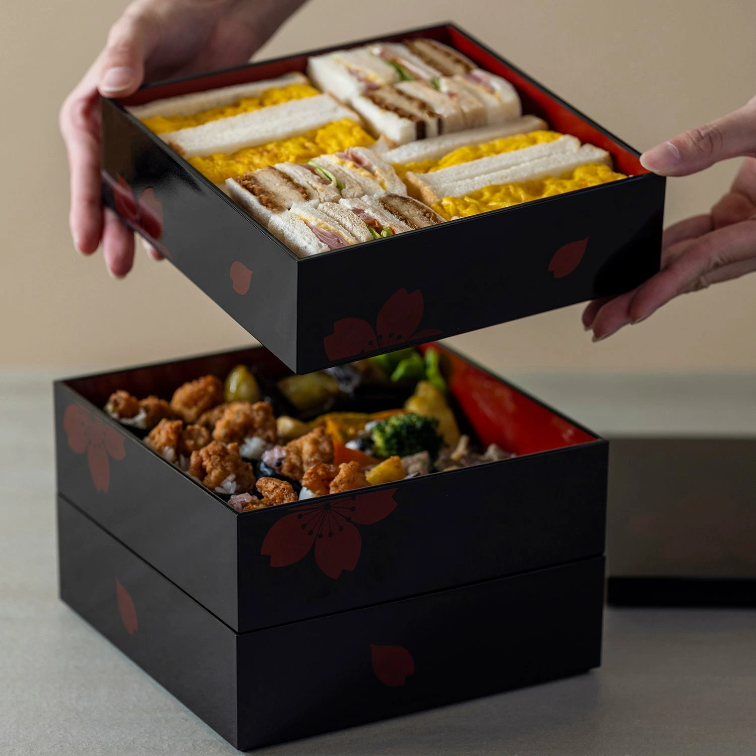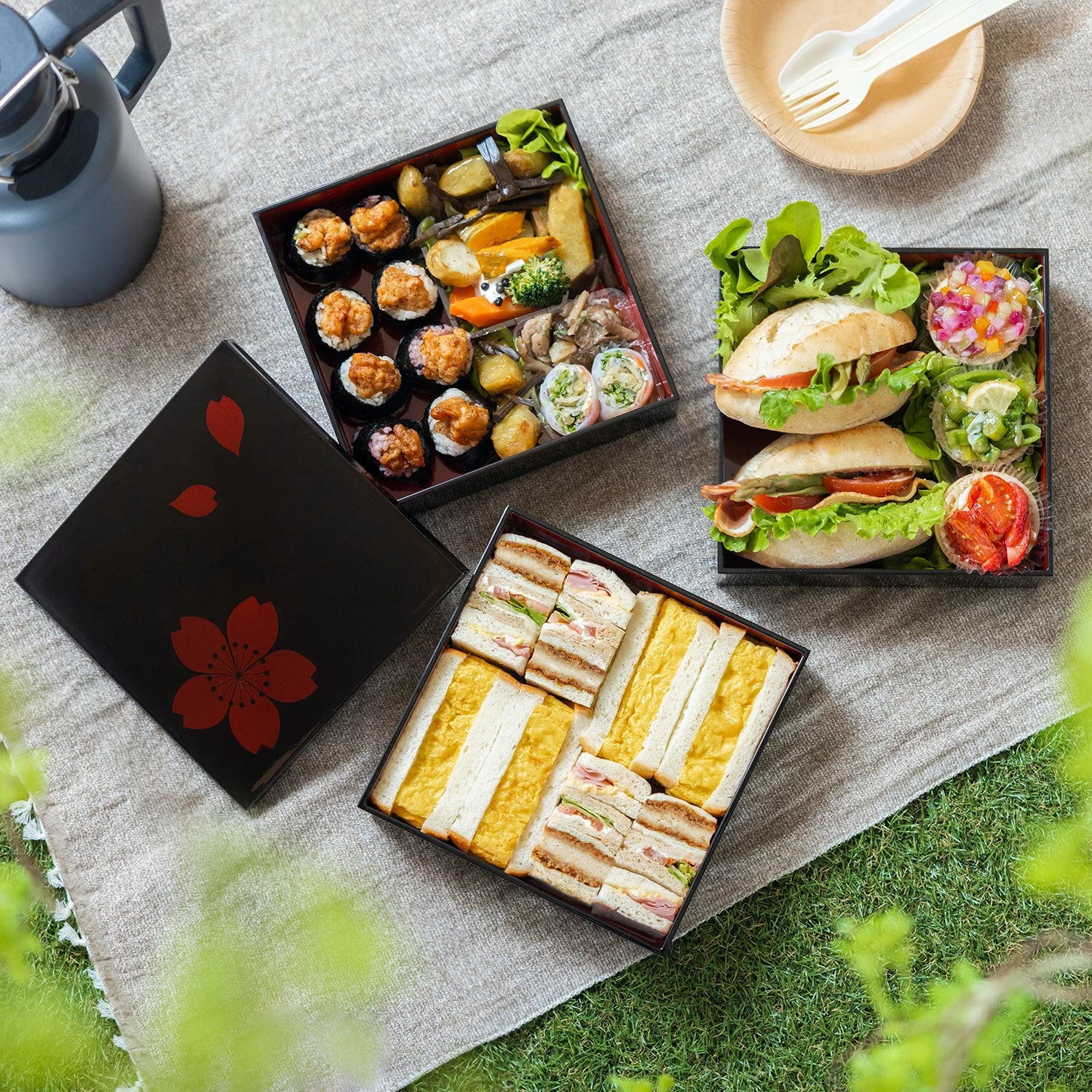 - Jubako with a modern cherry blossom pattern design.